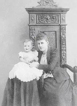 Grand Duchess Maria Pavlovna was born 18 April [O.S. 6 April] 1890 in Saint Petersburg. She was the first child and only daughter of Grand Duke Paul Alexandrovich of Russia and his first wife, Grand Duchess Alexandra Georgievna of Russia, born Princess Alexandra of Greece and Denmark.[1] The baby was named after her late paternal grandmother, the Empress Maria Alexandrovna, and her paternal aunt, maternal grandaunt, and godmother, the Empress Maria Feodorovna, and was known by the nickname "Marisha"[2][3] Maria was not yet two years old when her mother died from complications after giving birth to Maria's younger brother, Grand Duke Dmitri Pavlovich of Russia in 1891.[4] Grand Duke Paul was so distraught by the unexpected death of his young wife that he neglected his two small children, who were left in the care of his elder brother, Grand Duke Sergei Alexandrovich, who had no children of his own. Once he recovered emotionally, Grand Duke Paul took the two children away with him. A commander of the Imperial horse Guards, Grand Duke Paul loved his children, but as was customary at the time, he refrained from showing them spontaneous affection.[5] Maria and her brother were raised by governesses and tutors, but they adored their father who visited them twice a day.[5] The children spent Christmases and later some summer holidays with Grand Duke Sergei and his wife Grand Duchess Elisabeth Feodorovna.[6] The couple set aside a playroom and bedrooms for the youngsters at their country home Ilinskoe.[7]
