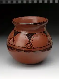 The Maricopa are known for their basket weaving and textiles,[1] in particular, for their highly burnished red-on-redware pottery. Their traditional pottery practices enjoyed a revival from 1937 to 1940. Elizabeth Hart, a US Home Extension Agent, worked with a leading Maricopa potter, Ida Redbird, to form the Maricopa Pottery Cooperative. Redbird served as president of the cooperative, which had 17 to 19 master potters. Hart encouraged members to sign their work. Swastikas were a common traditional motif that was abandoned in the 1940s, due to the Nazi usurpation of the symbol. The paddle and anvil method of construction is used, and, while utilitarian cookware is tempered, decorative Maricopa pottery has no temper.[9]