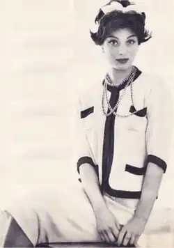 The 1954 comeback collection received a "venomous" reception from the French press, not only because Chanel had yet to regain her reputation following her controversial wartime activities but because the clothes were seen as essentially conservative and offering little new.[8] Bettina Ballard, the influential editor of American Vogue, remained loyal to Chanel, however, and featured Arnaud in the March 1954 issue,[8] photographed by Henry Clarke, wearing three outfits: a red dress with a V-neck, paired with ropes of pearls; a tiered seersucker evening gown; and, to cap it all and in response to both public – and Ballard's – demand, a piece of timeless Chanel – a navy jersey mid-calf suit.[9] Arnaud wore this outfit, "with its slightly padded, square-shouldered cardigan jacket, two patch pockets and sleeves that unbuttoned back to reveal crisp white cuffs", above "a white muslin blouse with a perky collar and bow [that] stayed perfectly in place with small tabs that buttoned onto the waistline of an easy A-line skirt."[10] Ballard had bought the suit herself, which gave "an overwhelming impression of insouciant, youthful elegance",[9] and orders for the clothes that Arnaud had modelled soon started pouring in from the States.[11]