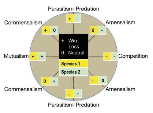 Possible ecological interactions between two individuals. The result of the interaction for each member of the pair can be positive, negative or neutral. For example, in predation, one partner obtains the benefits while the other assumes the costs.[1][2]