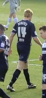Roberts started for Northwich in a 1–1 draw at Broadhall Way in a match between Northwich and Stevenage Borough on 15 November 2008,[33] and he subsequently joined the Hertfordshire club on loan a week after the match.[34] After impressing Stevenage manager Graham Westley during his one-month loan agreement, Roberts signed for the club on a permanent basis.[34] He scored his first Stevenage goal in a 2–0 FA Trophy victory away to Farnborough on 14 January 2009.[31][35] Roberts scored his first league goal for the club in a 2–1 victory away to Altrincham on 28 February 2009, a goal in stoppage time to give Stevenage the win at Moss Lane.[31][36] Roberts continued to play regularly as Stevenage made the play-offs as a result of finishing in the final play-off place.[31] He scored in the semi-final first leg against Cambridge United, heading in from Steve Morison's ball across goal, as Stevenage went on to lose 4–3 on aggregate over the two legs.[37][38] Roberts was awarded Stevenage's Player of the Year at the end of the season.[39] He also started in all seven of the club's FA Trophy matches during that season, scoring twice and playing in the team's 2–0 victory against York City in the final on 9 May 2009.[40] In May 2009, Roberts was named as Stevenage team captain for the 2009–10 season.[41] On Roberts' appointment as captain, Westley stated: "Roberts is a natural leader who leads in the best way – by example. He is the obvious choice."[41]