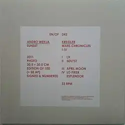 The first flapper of the gatefold sleeve holds Sunset a photo print signed by Andro Wekua,[9] the second flapper the vinyl.