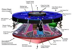 The cruise stage is the component of the spacecraft that is used for travel from Earth to Mars. It is very similar to the Mars Pathfinder in design and is approximately 2.65 meters (8.7 feet) in diameter and 1.6 m (5.2 ft) tall, including the entry vehicle (see below).