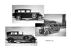 The Martini Six, while of a mainstream design, maintained Martini's high quality and workmanship standards and was an accordingly expensive car. Only a few hundred were built from 1927 until 1930, with the lion's share being sold at home in Switzerland.[7] The FU and the FUG engine shared a 120 mm (4.7 in), with a 74 mm (2.9 in) or an 84 mm (3.3 in) bore for the smaller and larger engine, respectively. Power outputs were 55 and 90 PS (40 and 66 kW) at 3000 and 3200 rpm.[6] The larger version proved considerably more popular and a series of revisions beginning in 1929 was mainly applied to the 4.4-litre version. The updated versions were sold as the Martini FUS and FN (and the smaller-engined FUN) with various improvements. Already in 1929 the updated FUS gained a four-speed gearbox, all-wheel brakes, and twin Zenith carburettors.[7] In 1931 the FUN and FN versions were discontinued, but next year's NF model was a modernized version of the earlier FN.