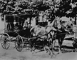 The Board of Trustees of the library obtained a Carnegie gift of $2,500 to fund the wagon. The first book wagon was a horse-drawn Concord wagon, which could transport 2,560 volumes stored on shelves on the outside and storage space inside the wagon. The library janitor, Joshua Thomas, drove the wagon, as he was a county native, familiar with the geography of the county and its residents. In the first six months, the book wagon made 31 trips, averaged 30 miles traveled per day, and distributed 1,008 volumes. Titcomb gave specific orders not to rush from house to house, but to allow each family enough time to choose their books.[4]