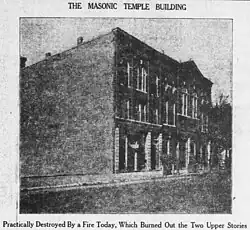 - ^ a b c "Masonic temple swept by fire; the loss may exceed $100,000". Salina Evening Journal. Vol. 37. January 30, 1922. p. 1. Retrieved July 22, 2025 – via Newspapers.com.