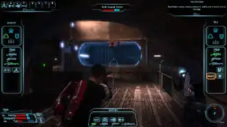 Hudson explained that they wanted to evolve the pseudo-turn-based combat of Knights of the Old Republic into a real-time third-person shooter interface.[22] The combat was meant to offer the tactics and customization of a role-playing game, but through a simpler and more intuitive user interface.[18] It was also designed so that players would not need to press many buttons to pull off the squad's different attack combinations.[23] The team worked closely with Microsoft on several elements of the interface to make sure the combat was tactical enough,[24] and went through a lot of trial and error to balance the combat between role-playing game and shooter.[24]