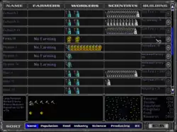 Players can manage their economies almost entirely from the Colonies screen. The Colonies screen allows the player to access any colony's Build screen, and to change a colony's output by moving colonists between Farmers, Workers and Scientists.[5]: 1 [6]: 35–36, 56–59  The Build screen allows the player to queue up to seven items for construction at a colony, to refit ships in that colony's system and to design ships that may then be built at any colony.[6]: 60–62