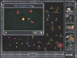 The main screen: the pop-up window displays information about a specific star system, while the large window under it displays the galaxy as a whole.