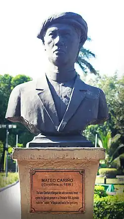 Mateo Cariño was an Ibaloi chieftain[2] who owned the land that was to become Baguio. He led a successful revolt against the Spanish garrison in La Trinidad and was proclaimed the Capitan Municipal of Baguio by President Emilio Aguinaldo.
