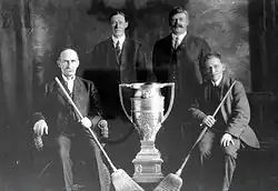 McCauley was an active member of the Edmonton community. He served as a director of the Edmonton Agricultural Association for 16 years.[24] The association brought the Edmonton Exhibition to Edmonton, one of the prominent fairs of the west at the time.[18] As telephone service was brought to Edmonton, McCauley was one of the first to receive one installed. His telephone number was #1.[18] When John Hamilton-Gordon, 1st Marquess of Aberdeen and Temair would visit Edmonton for business, McCauley and his wife would usually be the ones to entertain him.[25] Also an avid curler, McCauley was a founder of the Royal Curling Club in Edmonton and led his curling team where he served as a skip.[10] He also enjoyed other sports, including horse carriage racing.[27]