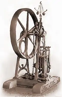 The needs of the growing firm demanded both larger quarters and an improved power source.[3] In 1828 Baldwin devised and constructed his first steam engine, a stationary device that produced 5 horsepower of output and remained in use in the shop for four decades.[3] Baldwin's engine was not only the most powerful of its day but also incorporated mechanical innovation to power rotary motion, which ultimately came to have application in transport, including marine engine design.[3] The original engine still survives in the Smithsonian Institution in Washington, DC.