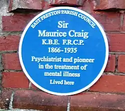 Blue plaque for Sir Maurice Craig. South Strand, East Preston, West Sussex, UK