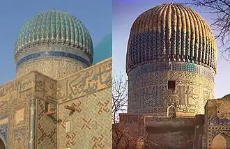 Prominent examples of Timurid domes: from Turkestan's Mausoleum of Khoja Ahmed Yasawi, left, and from Samarkand's Gur-i Amir, right.