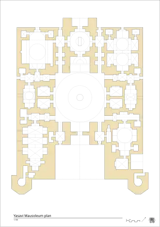 The primary material used for the building is ganch—fired brick mixed with mortar, gypsum and clay[3]—which was made in a plant located in Sauran.[14] Layers of clay reaching a depth of 1.5 m (4.9 ft), to prevent water penetration, were used for the original foundation.[14] These were replaced with reinforced concrete in modern restoration works.[3] The main entrance to the mausoleum is from the south-east, through which visitors are ushered into the 18.2 × 18.2-m (59.7 × 59.7-ft) Main Hall, known as Kazandyk (the "copper room").[3][14][19] The section is covered by the largest extant brick dome in Central Asia, also measuring 18.2 m (59.7 ft) in diameter.[19] At the center of the Kazandyk is a bronze cauldron, used for religious purposes.[14] The tomb of Yasawi is situated on the central axis at the end of the building in the northwest, with the sarcophagus located exactly at the center of the section, which has a double dome ribbed roof —the inner dome being 17.0 m (55.8 ft) high and the outer dome being 28.0 m (91.9 ft) high.[14] The dome exterior is covered with hexagonal green glazed tiles with gold patterns.[14] The interior is adorned with alabaster stalactites, known as muqarnas.[3] Additional rooms in the structure, totaling more than 35,[19] include meeting rooms, a refectory, a library, and a mosque, where fragments remain of the light blue geometric and floral ornaments on its walls.[14] The mausoleum's exterior walls are covered in glazed tiles constituting geometric patterns with Kufic and Suls epigraphic ornaments derived from the Qur'an.[3] Initial plans also called for the addition of two minarets, but this was not realized when construction was halted in 1405.[3][14]