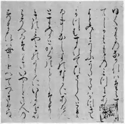 The foundations for this style of poetry were laid by Teika and his father Shunzei, not just in their poetry but in their highly regarded works of poetic theory (karon and kagaku-sho).[1] These include Shunzei's Korai Fūtei-shō (also valuable as an exploration of the history of waka) and Teika's Maigetsu-shō and Kindai Shūka (近代秀歌).[1] Such works had a tremendous influence on later waka poets, and their philosophy of fūtei (風体, "style") has had value for Japanese aesthetics and art generally.[5] Other works of poetic theory include those that are noted for their recording of various anecdotes about waka poets, including Kamo no Chōmei's Mumyō-shō.[6]
