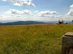The summit plateau is traversed by a main path from the Tetřeví chata tourist intersection, marked with an informational board indicating an elevation of 1,165 m, to the Medvědí hora (Rysí skála) tourist stop, marked with an informational board indicating an elevation of 1,162 m.[3] The summit plateau is forested with spruce forest and covered with alpine grass. There is a secondary triangulation station on the summit plateau in the form of a benchmark, marked on geodetic maps with the number 22.3, at an elevation of 1,162.20 m and geographical coordinates 50°05′19.06″N 17°08′49.05″E / 50.0886278°N 17.1469583°E, located about 20 m northwest of the summit. On the summit, there is a rock group that serves as a limited viewpoint, offering restricted views towards Dlouhé stráně mountain. The State Administration of Land Surveying and Cadastre lists the highest point – the summit – at an elevation of 1,163.6 m with geographical coordinates 50°05′15.9″N 17°08′49.8″E / 50.087750°N 17.147167°E.[5][6]
