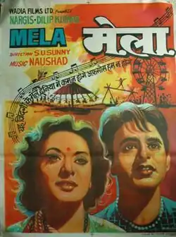 Mela (transl. The Fair) is a 1948 Indian Hindi-language romantic tragedy film. It was produced by and directed by S.U. Sunny for Wadia Movietone. It starred Dilip Kumar, Nargis, Jeevan, Rehman and Nur Jehan.[1] The film's music was composed by Naushad. Mukesh gave playback for Dilip in this film and one of the "Mukesh hits" was "Gaye Ja Geet Milan Ke". Mohammed Rafi's voice was used just once, for the popular song "Ye Zindagi Ke Mele", set in a fairground and picturised on a wandering mendicant at the start of the film.[2] The lyrics of the songs were written by Shakeel Badayuni with story and dialogue by Azam Bazidpuri.[3]