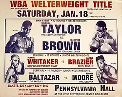 Meldrick Taylor vs. Glenwood Brown was a professional boxing match contested on January 18, 1992, for the WBA welterweight title. The fight took place at the Philadelphia Civic Center in Taylor's native Philadelphia, Pennsylvania. The featured undercard bout saw Taylor's friend and stablemate Pernell Whitaker, who was coming off a stint as the undisputed lightweight champion, making his super lightweight debut against former contender Harold Brazier.[1]