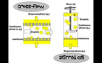 In this process, the dispersed phase is forced through the pores of a microporous membrane directly into the continuous phase. Emulsified droplets are formed and detached at the end of the pores with a drop-by-drop mechanism. The advantages of membrane emulsification over conventional emulsification processes are that it enables one to obtain very fine emulsions of controlled droplet sizes and narrow droplet size distributions. Successful emulsification can be carried out with much less consumption of emulsifier and energy, and because of the lowered shear stress effect, membrane emulsification allows the use of shear-sensitive ingredients, such as starch and proteins.[9] The membrane emulsification process is generally carried out in cross-flow (continuous or batch) mode or in a stirred cell (batch).[10][11]