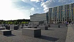 The memorial is located on Cora-Berliner-Straße 1, 10117 in Berlin, a city with one of the largest Jewish populations in Europe before the Second World War.[8] Adjacent east to the Tiergarten, it is centrally located in Berlin's historical Friedrichstadt district, close to the Reichstag building and the Brandenburg Gate.[9] The monument is situated on the former location of the Berlin Wall, where the "death strip" once divided the city. During the Third Reich a part of this area was the location of Joseph Goebbels' urban villa, with the nearby Reich Chancellery and the Führerbunker in the south.[10] The memorial is located near many of Berlin's foreign embassies.[9]