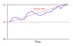 This model and its variants account for these distributional features by partitioning a reaction time trial into a non-decision residual stage and a stochastic "diffusion" stage, where the actual response decision is generated. The distribution of reaction times across trials is determined by the rate at which evidence accumulates in neurons with an underlying "random walk" component. The drift rate (v) is the average rate at which this evidence accumulates in the presence of this random noise. The decision threshold (a) represents the width of the decision boundary, or the amount of evidence needed before a response is made. The trial terminates when the accumulating evidence reaches either the correct or the incorrect boundary.[44]