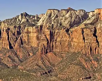 Meridian Tower is situated 2 mi (3.2 km) northwest of Zion's park headquarters, towering 3,350 feet (1,020 m) above the floor of Zion Canyon and the Virgin River which drains precipitation runoff from this mountain. Its neighbors include The West Temple, The Sundial, The Witch Head, Altar of Sacrifice, Bee Hive, and The Sentinel. This feature was so named by the park's third superintendent, Preston P. Patraw, because its flat top is crossed by the 113th meridian.[2] Meridian Tower's name was officially adopted in 1934 by the U.S. Board on Geographic Names. The first ascent of Meridian Tower was not made until March 2016 by Dan Stih and Matt Mower.[3]