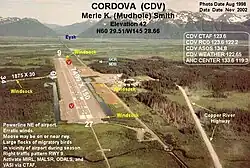 Merle K. (Mudhole) Smith Airport (IATA: CDV, ICAO: PACV, FAA LID: CDV) is a state-owned public-use airport located 11 nautical miles (13 mi, 20 km) southeast of the central business district of Cordova, a city in the Chugach Census Area of the U.S. state of Alaska which has no road access to the outside world.[1] Airline service is subsidized by the Essential Air Service program.