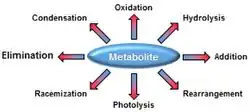 Many metabolites are chemically reactive and unstable, and thus prone to chemical damage. In general, any reaction that occurs in vitro under physiological conditions can also occur in vivo.[3][4] Some metabolites are so reactive that their half-life in a cell is measured in minutes.[2] For example, the glycolytic intermediate 1,3-bisphosphoglyceric acid has a half-life of 27 minutes in vivo.[5] Typical types of chemical damage reactions that can occur to metabolites are racemization, rearrangement, elimination, photodissociation, addition, and condensation.