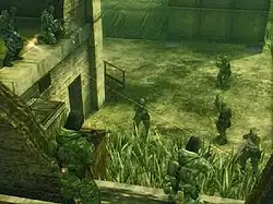 Kojima commented that the outside environment was challenging to create.[38] He explained that the reason previous games were primarily set indoors is that the current consoles were not powerful enough to portray a true jungle environment.[39] In contrast with urban environments, the jungle does not have a flat surface. The protagonist in Snake Eater has to cross uneven terrain, including rocks, dirt mounds, and tree stumps. As a result, the collision engine used in previous installments could not be used, and a new one had to be built from scratch.[39] Setting up the motion capture technology so players could walk over these mounds was a problem during development.[38] Many fans wanted Snake Eater to use a 3D camera, but this was ultimately not implemented in the game. Kojima views Metal Gear Solid, Sons of Liberty and Snake Eater as a trilogy, and wished to keep the camera the same as the previous two, to keep the feel of the three games the same, despite the shifting trend towards full 3D camera movement.[40]
