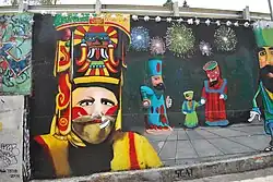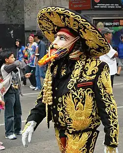 The developing dances and other masked events became part of a syncretism of Catholic and native traditions and belief, especially Carnival and Holy Week, with the first coinciding with the Aztec New Year and new agricultural cycle.[11] In addition, many of the masks developed during this time mocked colonial overlords.[13] For these reasons, at various times, masks and dances were forbidden by authorities from the 16th to 18th centuries.[12][14]