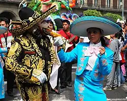 The parade begins at midday on a Saturday late in October, with about 400 uniformed officers needed to clear the parade route and keep order.[7] This route takes the alebrijes through the historic center of Mexico City, from the main square or Zocalo, onto Paseo de la Reforma down to the Angel de la Independencia .[6] Thousands of people, mostly children and their parents, line the 5.5 km parade route to see the creations.[5][8] The alebrijes are accompanied by musical bands such as the Symphonic Band of the Navy, clowns, people on stilts and in costume, cheerleaders, acrobats, lucha libre wrestlers and more to give a Carnival like atmosphere.[5][9][10] In addition to the alebrijes, other figures of cartonería appear such as Catrina figures, 30 cm brightly decorated skulls (related to Day of the Dead) as well as Judas figures (normally made for Holy Saturday) as a tribute to the traditional uses of this craft.[5][11]