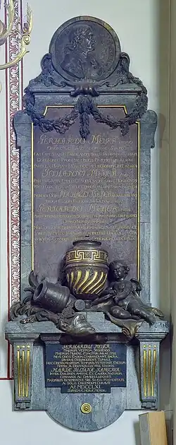 A North-German origin of the Meyer family is most likely. Hans Meyer, member of the first known generation of this family, had relations to Lübeck, an important Hanseatic city with long tradition in metal casting. He himself wrote in Low-German, as is customary in Northern Germany.[1] It is possible that he was related to another Hans Meyer, "by der Trave", who was the son-in-law of Lübeck's foremost caster Karsten Middeldorp (+1561).[2] The misreading of a cannon's inscription led in the past to the false assumption that the Meyer family were of Nuremberg origin.[3] The German origin is stated on the epitaph of the Swedish branch of the Meyer family in the Klara Church in Stockholm (“Origine Germano”), erected in 1761.[4]
