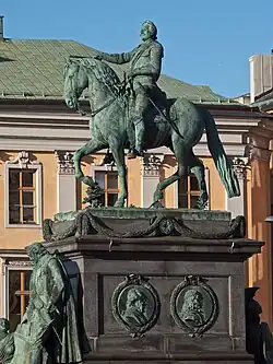 In 1695, back in Sweden, he became liveryman of the Stockholm guild,[74] head of the Royal foundry[75] and married in the very same year Catharina Kammecker. Soon after, Meyer wrote to the king offering to cast "large metal statues and other decorations" as well as iron "stoves", works which Meyer pretended to be able to execute thanks to his French experiences.[76] He requested to the Royal artillery department (War College) permission to be also allowed to cast portrait busts, statues and other kind of works in order to secure the financial success of his workshop.[77]