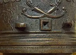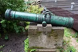 Johann (II) died in 1669. He was son of Johann (I)) and, like his siblings, underage in 1610, the year of his father's death.[24] He must have received part of his formation like his brothers Georg and Gerhardt from Medardus Gessus. In 1637 he was appointed head of the Royal Danish foundry in Helsingör[25] with the salary paid out of the Öresund toll.[26] In 1640 he took over this foundry and became independent, losing the privilege of casting cannons which was restricted to foundries which were under direct control of the state.[27] Over 20 church bells cast by him are known today. One of his bells, made for Kronborg Castle, was the biggest bell cast in Denmark until then.[28] In 1655 he was appointed head of the Royal foundry in Copenhagen, with casting guns as his primarily occupation.[29] At this time cannon production in three important places of the Baltic, Copenhagen, Riga and Stockholm, were in the hands of the three sons of Johann (I) Meyer. The difficult economic situation due to King Christian IV's unsuccessful military enterprises brought loss of production in the years 1657–60.[30] Johann (II) held his position until his death in 1669.[31] Among the children he had with his Danish wife Sophia was Hans (Johann) born in 1645.[32] His godfather was Claus van Damm of a Hamburg-based family of casters and Johann (I)’s predecessor as head of the Copenhagen foundry.[33]