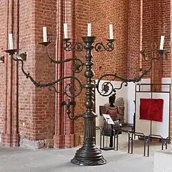The first member of the Meyer family linked with the Swedish capital is Gerhardt (I): "Me fecit Gerhardt Meyer Holmiae" – Holmia is the Latin name for Stockholm – is the caster's signature on a bronze sculpture of a Bathing Venus (1597).[34] In the years 1592–1595 a Gärt (Gerhardt) Meyer is documented in Stockholm.[35] He seems to have left the Swedish capital in 1596 by moving to Riga, where he was briefly active in Hans Meyer's workshop. Hans and Gerhardt must have been close relatives. Under Hans Meyer as head of the foundry, Gerhardt must have cast the monumental candelabrum for St. Peter's church.[36]
