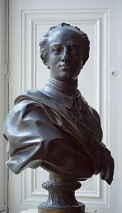 Gerhardt (VI) lived from 1704 until 1784. As a son of Gerhardt (IV) he was in 1720, ten years after his father's death, at the age of 16 already appointed Royal cannon caster by King Frederic I.[87] He moved to Uppsala and in 1724 he started a three-year journey through Europe, where he was an apprentice in foundries in Germany (possibly in Nuremberg),[88] Switzerland, France, The Netherlands and England. After his return to Stockholm he became head of the Royal foundry in 1728, following his father and his grandfather. His main business must have been bell-casting, as in Finland alone 47 bells of his hand are preserved.[89] Besides, he made bronze casts after models of the leading French artists of the time: busts of the Swedish Kings Charles XII (1747/48)[90] and Adolf Frederick (1749/51)[91] after Jacques-Philippe Bouchardon as well as puttoes and ornamental shields for the staircase of the Royal Palace.[92]