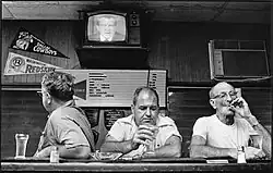 On the evening of Richard Nixon's resignation speech, August 9, 1974, The Miami News sent out all its staff photographers. O'Brien was sent to Duffy's, a blue-collar bar in Coral Gables. "It was a dark bar, but I set up strobes and used a Nikon with Tri-X film. During the speech I saw three men at the bar with their backs turned as Nixon resigned. Their apathy summed up the mood of the country." The Miami News used the photograph the next day for their front-page story.[6]