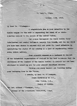 - ^ Hyde, Douglas (3 November 1904). "Letter from Douglas Hyde to Fr Michael O'Flanagan, saying he will be sorry to see him go to America". National Library of Ireland. Retrieved 31 January 2019.