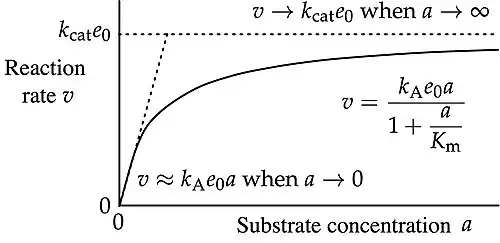 in which is the initial enzyme concentration. The reaction order depends on the relative size of the two terms in the denominator. At low substrate concentration , so that the rate varies linearly with substrate concentration (first-order kinetics in ).[15] However at higher , with , the reaction approaches independence of (zero-order kinetics in ),[15] asymptotically approaching the limiting rate . This rate, which is never attained, refers to the hypothetical case in which all enzyme molecules are bound to substrate. , known as the turnover number or catalytic constant, normally expressed in s –1, is the limiting number of substrate molecules converted to product per enzyme molecule per unit of time. Further addition of substrate would not increase the rate, and the enzyme is said to be saturated.