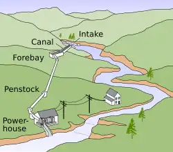 Microhydro systems are typically set up in areas capable of producing up to 100 kilowatts of electricity.[4] This can power a home or small business facility. This production range is calculated in terms of "head" and "flow". The higher each of these are, the more power available. Hydraulic head is the pressure measurement of water falling in a pipe expressed as a function of the vertical distance the water falls.[4] This change in elevation is usually measured in feet or meters. A drop of at least 2 feet is required or the system may not be feasible.[5] When quantifying head, both gross and net head must be considered.[5] Gross head approximates power accessibility through the vertical distance measurement alone whereas net head subtracts pressure lost due to friction in piping from the gross head.[5] "Flow" is the actual quantity of water falling from a site and is usually measured in gallons per minute, cubic feet per second, or liters per second.[6] Low flow/high head installations in steep terrain have significant pipe costs. A long penstock starts with low pressure pipe at the top and progressively higher pressure pipe closer to the turbine in order to reduce pipe costs.