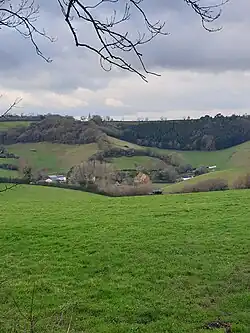 The landscape consists almost exclusively of hilly farmland. Traditional Devon hedgerows establish field boundaries with older, medieval boundary banks still visible from above as earthwork ditches, having fallen out of use by the mid 19th century.[7] Due to its rural location, Middle Rocombe is frequented by horse-riders, walkers and ramblers,[8] supported by the several green lanes that connect to the hamlet. Furthermore, it is a point and intersection on the John Musgrave Heritage Walking Trail, forming part of section one from Maidencombe to Cockington; its significance is listed as the origin of Rocombe Farm Ice Cream.[9]