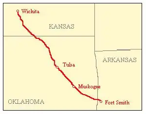 The Midland Valley Railroad (MV) was a railroad company incorporated on June 4, 1903 for the purpose of building a line from Hope, Arkansas, through Muskogee and Tulsa, Oklahoma to Wichita, Kansas. It was backed by C. Jared Ingersoll, a Philadelphia industrialist who owned coal mining properties in Indian Territory (now part of the state of Oklahoma).[1] The railroad took its name from Midland, Arkansas, a coal mining town in western Arkansas, which was served by the railroad.[a] The Midland Valley gained access to Fort Smith, Arkansas via trackage rights over the Frisco from Rock Island, Oklahoma.