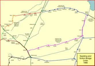 The Midland and Eastern Railway leased the Norwich and Spalding line, but the N&SR remained nominally independent until 1 July 1877.[4] It needed to go to Parliament to plead that it had, in good faith, tried to make a Sutton to Wisbech line, but had been prevented; and that the line had in fact been pre-empted by the PW&SBR; this was accepted and the N&SR was released from the prohibition on declaring a dividend. The Midland and Eastern Railway now effectively controlled the whole of the western section of the future M&GNJR, except for the Peterborough to Sutton Bridge line, which was still controlled by the Midland Railway.[3]