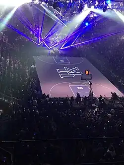 In 1982, coach Joe B. Hall and the Kentucky Wildcats men's basketball team began to officially promote a celebration dubbed "Midnight Madness" as a school event with formal entertainment acts and an invited student audience. This event was held in Memorial Coliseum and held 8,500 people in the then-12,500 seat gym.[4] Big Blue Madness is now televised and hosts celebrities including Drake, who performed in 2014.[5] Another of the more famous events is "Late Night in the Phog" at Kansas, which was started in 1985 by Larry Brown and is now broadcast in live streaming video via the Internet.[6] The event has caught on on most campuses; various programs have given away T-shirts and allowed players do stunt dunks and half court shots.[2] Some schools schedule intrasquad scrimmages, three-point shooting contests and/or slam dunk contests. The event is often a co-ed event, in which both the men's and women's teams participate in the celebration, especially at schools like the University of Connecticut, where the men's and women's teams have a combined 15 championships.[7] Scout.com estimated that in 2007, approximately 160 of the top blue chip high school basketball recruits in the country were attending a Midnight Madness event during the weekend that opens the basketball season.[8]