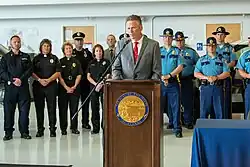 A massive 7.1 magnitude earthquake struck Southcentral Alaska on November 30, three days before Dunleavy took office, causing significant damage throughout the region.[23] Within hours, he and his team assessed the situation at the State Emergency Operations Center (SEOC) alongside the outgoing administration of Governor Bill Walker. On December 31, Dunleavy returned to the State Emergency Operations Center to personally thank the SEOC staff for their service.[24]