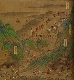 Princes of the Imperial family were also granted substantial military authority in strategic points around the empire. Each was granted an estate with the power to recruit military officers for their personal staff (this was restricted in 1395) and held total judicial authority over them. This ancient system, intended to provide military experience before deployment, had not been used in China for a thousand years.[42] Princes were also dispatched to join campaigns with their personal bodyguards. Zhu Di, Prince of Yan, impressed the Hongwu Emperor with his command of the 1390 campaign against the Mongols under Nayir Bukha and was allowed to retain command of the 10,000 Mongol soldiers he had captured. This later aided the prince in his usurpation of the throne. In some cases the princes were appointed to fill vacant command positions. Zhu Gang, the Prince of Qin, was sent to build military colonies (tuntian) beyond the Great Wall.[43] Princes were granted an escort guard (huwei bing) under their personal control, while a court-appointed officer commanded the shouzhen bing or garrison force, over which the princes only had authority during emergencies declared by the Emperor. This dual chain of command was meant to prevent a coup d'état in the capital. The garrison force could only be deployed with an order carrying both the Emperor's and the Prince's seal. The Regional Military Commission armies were then used to check the princes' military power. Many princes amassed large bodyguard forces and transferred regular soldiers to their personal command without authorisation anyway, using them on campaign.[44] The authority of princes was curtailed by the Jianwen Emperor. When the Yongle Emperor came to power, he further purged his brothers on trumped up charges and abolished most of the princely guards; by the dynasty's end there were less than a dozen extant. He also established a hereditary military nobility from his top generals during his usurpation, both Han Chinese and Mongol. They were however denied long-term commands so as to prevent personal power bases from forming.[45]