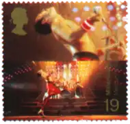 One of the most notable postage stamps in the collection was one commemorating the life of Queen frontman (and avid stamp collector) Freddie Mercury.[4] It caused controversy for the appearance of Roger Taylor in the background at the drums, as it was an understood rule at the time that the only living people allowed to appear on British stamps could be members of the British Royal Family. However, Sir Francis Chichester had appeared on a Royal Mail postage stamp, while still alive, in 1967.[5]