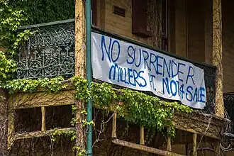 A protest movement developed from 2008 when various governments announced plans to lease and sell Millers Point, Dawes Point and The Rocks properties and move existing public housing tenants. "Save Our Community", "Friends of Millers Point" and the associated "Save Our Sirius" formed to protest relocation of residents.[11]
