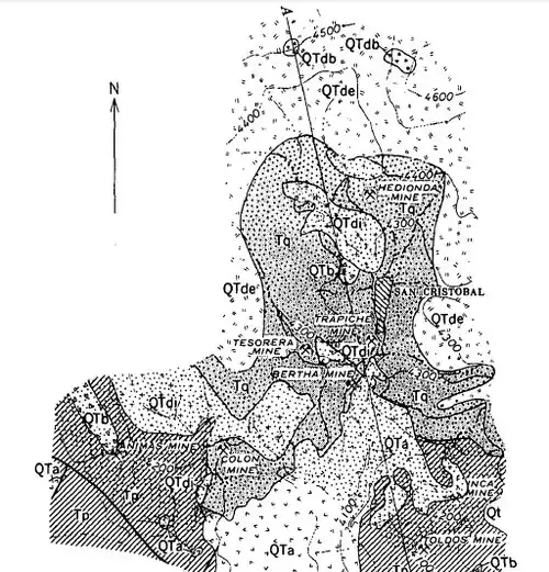 - ^ a b Jacobson, H.S., Murillo, C., Ruiz, L., Tapia, O., Zapata, H., Alarcon, H., Delgadillo, E., and Velasco, C., 1969, Geology and Mineral Deposits of the San Cristobal District, Villa Martin Province, Potosi, Bolivia, USGS Bulletin 1273, Washington: US Government Printing Office